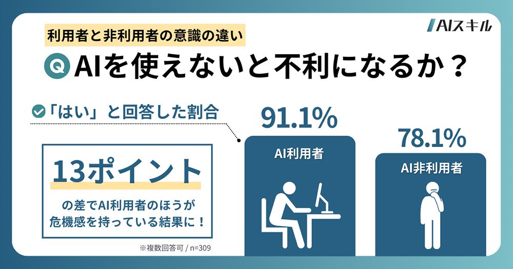 社会人向けのAIスキル学習を提供するAIスキルアカデミーは、20〜60代(ボリュームゾーンは30〜40代)の全国の男女309人を対象にAIスキルとキャリアに関するアンケート調査を実施した。309人のうち、AIを利用している人は158人、していない人は151人とほぼ半々の割合だ。