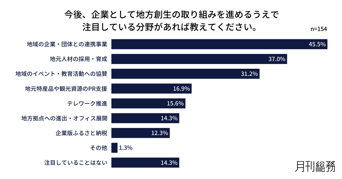 今後注目している分野では「地域の企業・団体との連携事業」(45.5%)が最多となり、「地元人材の採用・育成」(37.0%)、「地域のイベント・教育活動への協賛」(31.2%)が続いた。実際の取り組み内容と同様の傾向を示しており、現状維持を選ぶ企業が多いようだ。