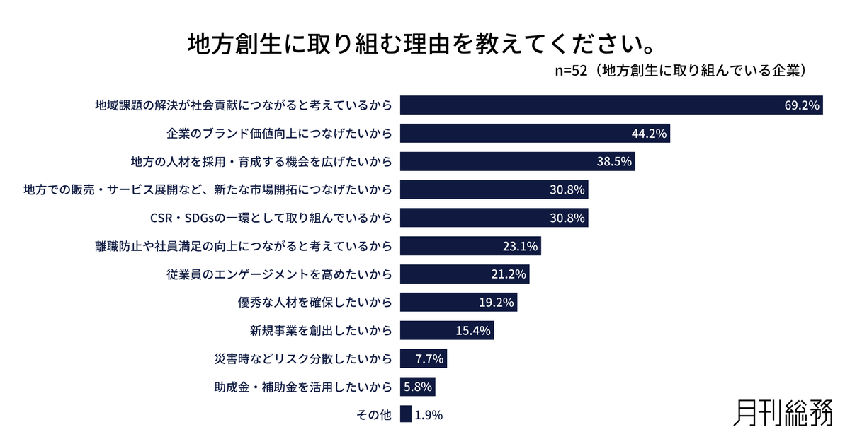 地方創生に取り組む理由では「地域課題の解決による社会貢献」(69.2%)が最多となったが、「企業のブランド価値向上」(44.2%)、「地方人材の採用・育成」(38.5%)を理由に挙げる企業も多く、CSRの枠を超えた戦略的な効果を期待する声も目立った。