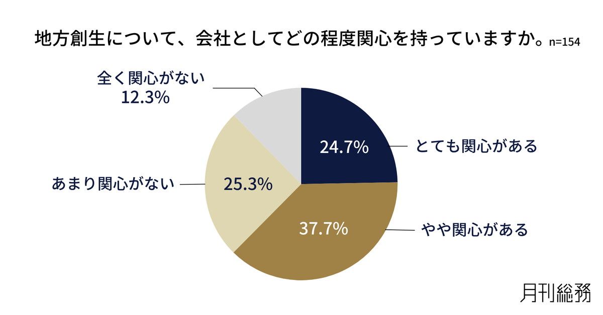 企業の地方創生への関心は一定程度あるものの、実際の行動には大きなハードルが存在するようだ。株式会社月刊総務が総務担当者154名を対象に実施した調査によると、62.4%の企業が地方創生に関心を示す一方で、実際に取り組んでいるのは33.7%にとどまることが明らかになった。関心と行動の間に約30ポイントのギャップが存在し、企業の地方創生をめぐる複雑な実情が浮かび上がった。