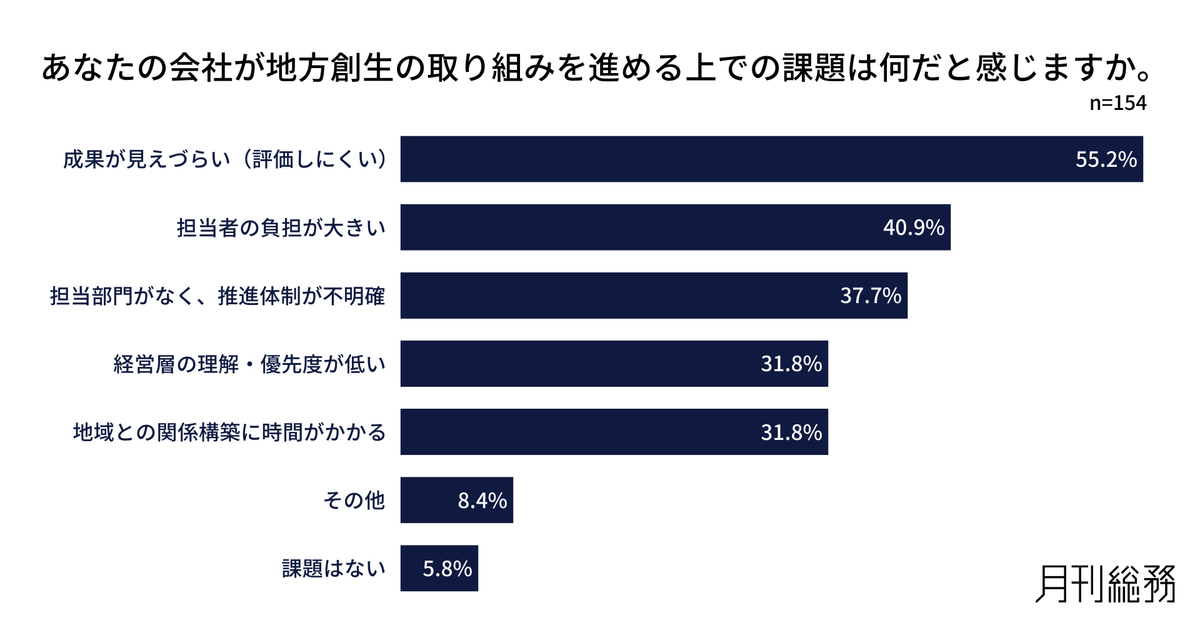 しかし、地方創生を進める上での最大の課題は「成果の見えづらさ」(55.2%)だった。続いて「担当者の負担が大きい」(40.9%)、「推進体制が不明確」(37.7%)となり、多くの企業が投資対効果の測定に苦慮している実態が明らかになった。