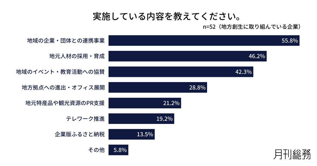 実際に地方創生に取り組んでいる企業の活動内容では、「地域の企業・団体との連携事業」が55.8%で最も多く、「地元人材の採用・育成」(46.2%)、「地域のイベント・教育活動への協賛」(42.3%)、「地方拠点への進出・オフィス展開」(28.8%)が続いた。