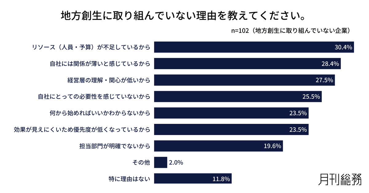 地方創生に取り組まない理由では「リソース不足」(30.4%)が最多となった。「自社には関係が薄い」(28.4%)、「経営層の理解・関心が低い」(27.5%)、「自社にとっての必要性を感じていない」(25.5%)も上位に入り、地方創生が余裕があればやりたい施策として位置づけられている企業が多いことがうかがえる。