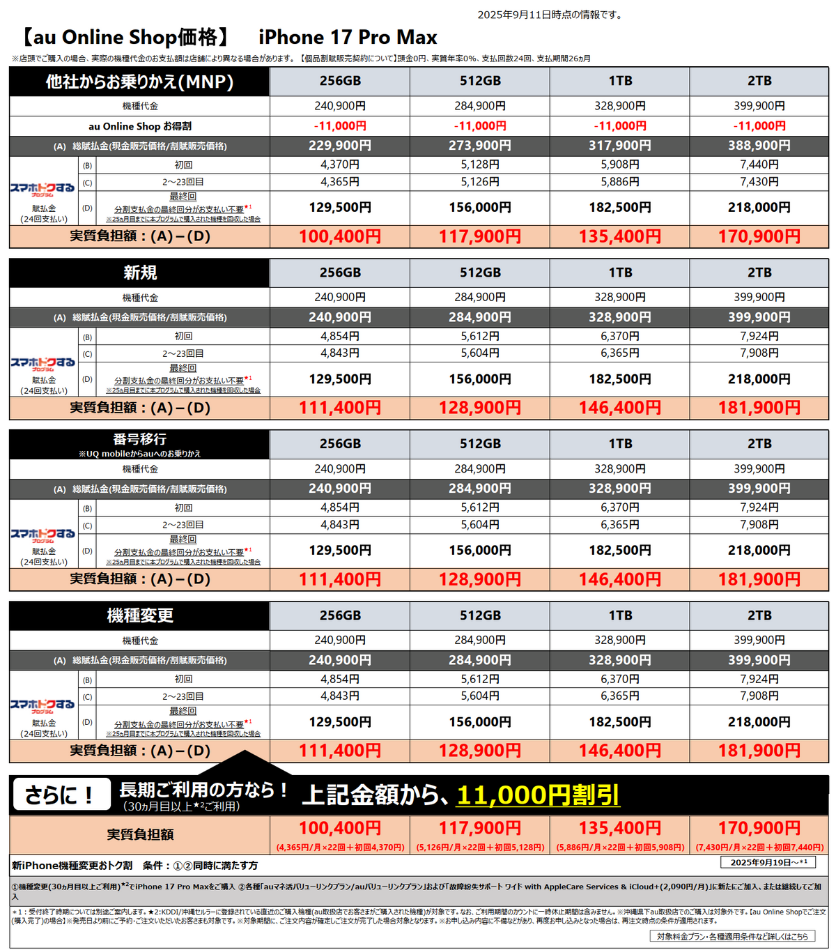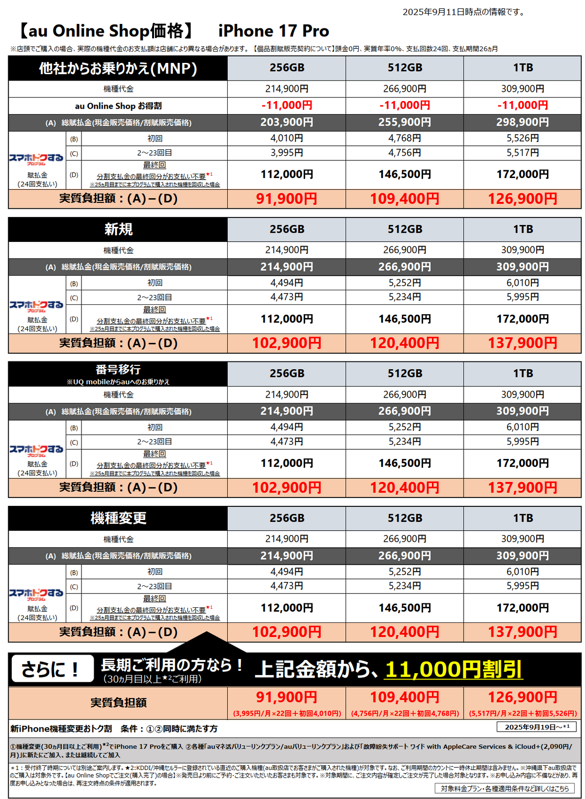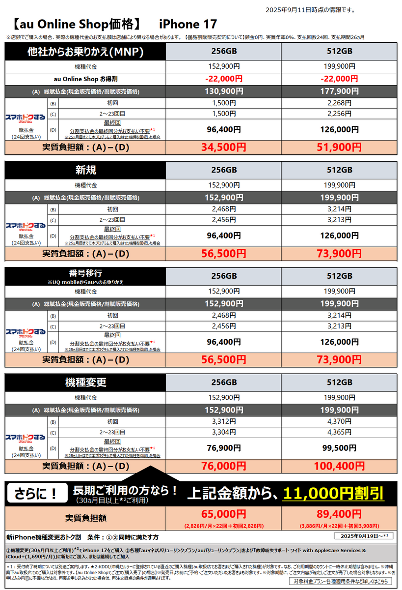 本体価格がアップルストアより2万5000円ほど高くなっており、そこからいかに割引を適用できるかが勝負となっている。他社からのりかえだと「au Online Shop お得割」によりiPhone 17で2万2000引き、そのほかで1万1000円引きでの販売価格となるが、新規や番号移行では割引はなく、機種変では「新iPhone機種変更おトク割」によって1万1000円の割引がある。ただし、30ヶ月以上の利用や各種プランへの加入が必要になるため、ハードルは低くない。ほかには、下取りプログラムが7700円の増額中となっており1万4300円からとなっている。また、手数料0円で24回払いの残額設定分割払い「スマホトクするプログラム」が可能。月々払いを抑えて2年後にまた機種変すれば、お安く手に入る仕組みになっている。