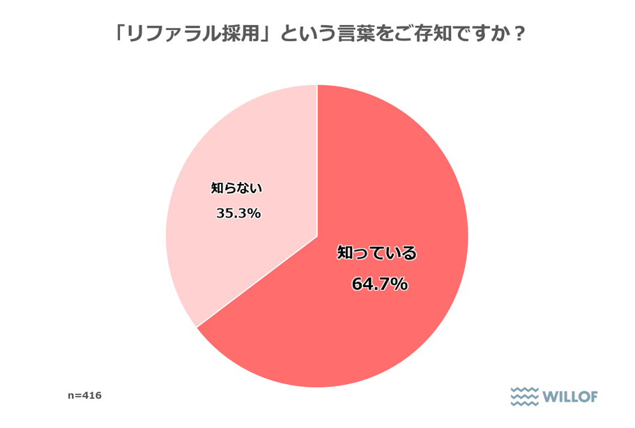 調査でまず「リファラル採用という言葉を知っているか」を聞いたところ、64.7%が「知っている」と回答した。人事・採用業界では既に広く認知されている制度であることがわかる。