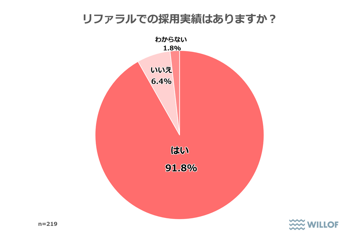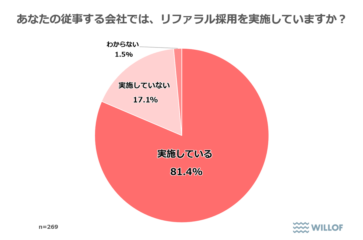 さらに、制度を認知している人事担当者に実施状況を確認すると、81.4%が「リファラル採用を実施している」と答えた。制度を知っている企業の8割以上が実際に導入しており、リファラル採用への期待の高さがうかがえる。
