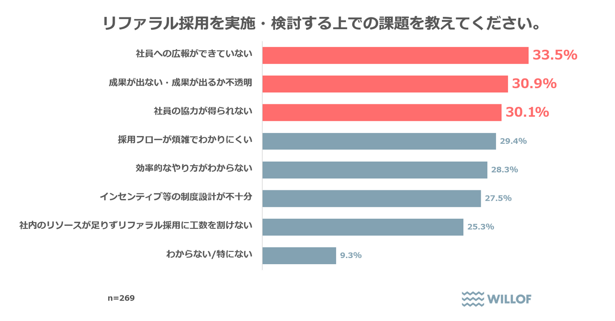 しかし、課題は存在する。実施企業に「リファラル採用を実施・検討する上での課題」を複数回答で聞いたところ、最も多かったのは「社員への広報ができていない」で33.5%を占めた。
