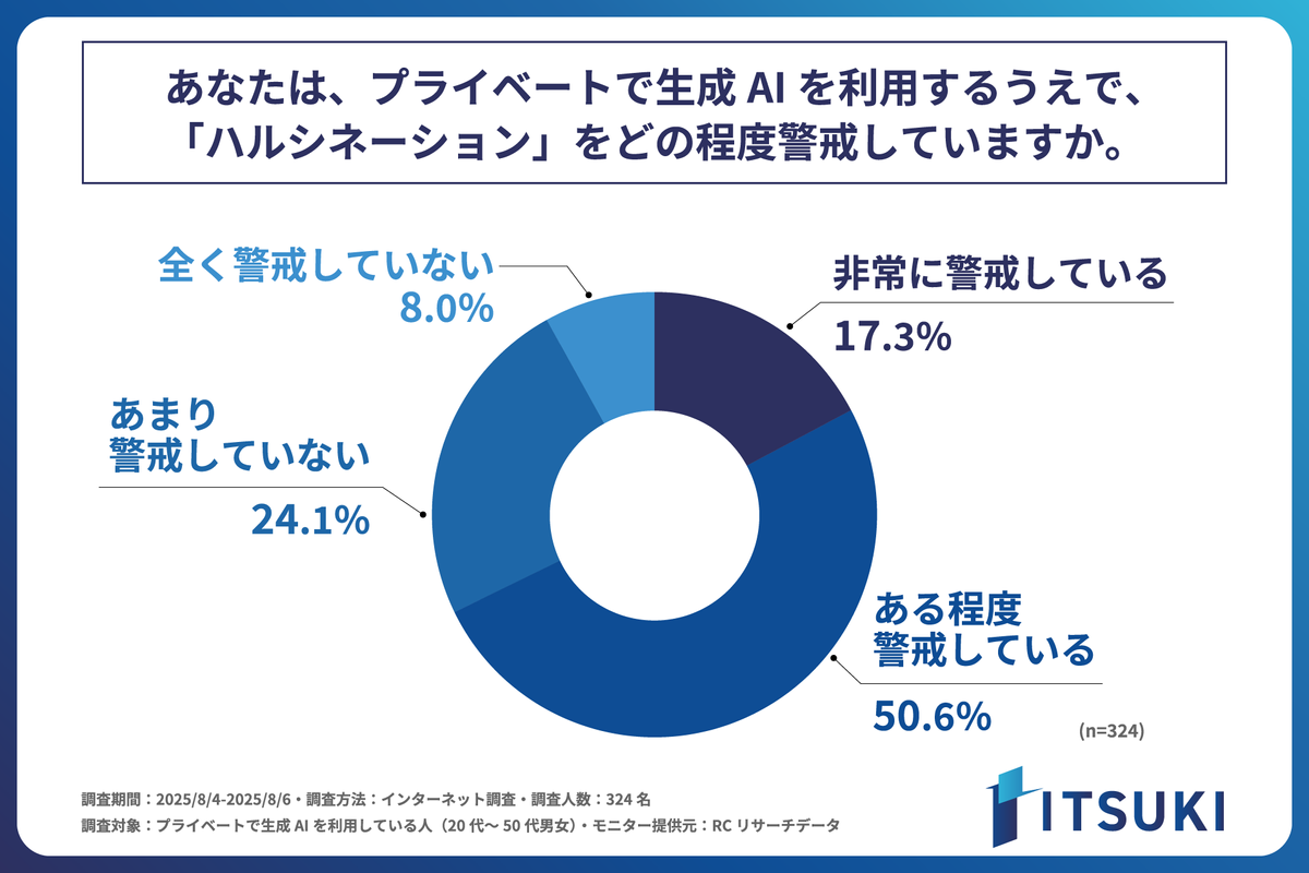 プライベートで生成AIを利用する人の約65%が、AIが誤った情報を生成する「ハルシネーション」という現象を十分に理解していないことが、インターネット回線事業を行う株式会社ITSUKIの調査で明らかになった。情報収集を主目的とする利用者が多いにもかかわらず、適切な対策を講じている人は4割未満にとどまっている。