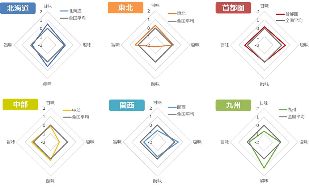 キユーピーは、惣菜の製造販売を行うグループ会社デリア食品と共同で、ポテトサラダの地域性を調査した。北海道、東北、首都圏、中部、関西、九州の6地域で販売されているポテサラ10点ずつ計60点を集め、その風味の分析を行い、地域ごとの分析データの平均値をグラフ化した。結果は以下のとおり。
