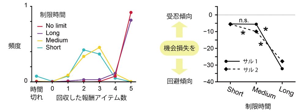 この実験では、こうした機会損失に関わる判断には、ドーパミンが深く関与していることもわかった。試しにサルのドーパミン受容体を阻害すると、時間が長い条件でも多くのアイテムを回収しようとしなくなった。