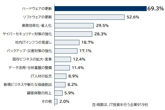 IT投資を行う企業に具体的な投資目的について尋ねたところ、「ハードウェアの更新」が69.3%でトップ。「ソフトウェアの更新」が52.6%、「業務効率化・省人化」が29.5%と続いている。業務効率化よりもまず既存システムの更新に費用が割かれているが、更新によって業務効率化も期待できるはずだ。