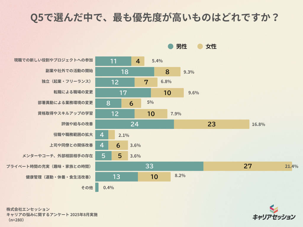 最も優先度が高いものを1つに絞ってもらった結果では、「プライベート時間の充実」が21.4%で最多となり、「評価や給与の改善」が16.8%で続いた。複数回答では上位だった「資格取得やスキルアップの学習」は7.9%に後退し、「転職による職場の変更」(9.6%)、「副業や社外での活動の開始」(9.3%)といった外向きの選択肢が相対的に少し存在感を増したかたちになった。