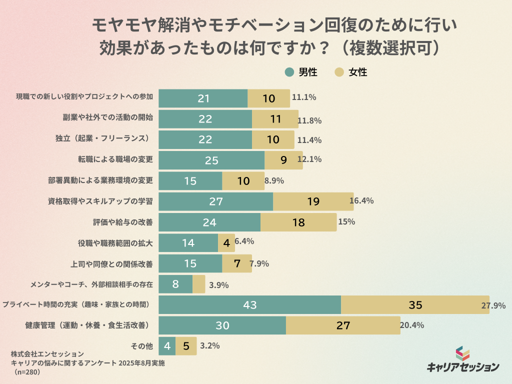 モヤモヤ解消のために実際に行った対策を複数選択で聞いたところ、「プライベート時間の充実(趣味・家族との時間)」が27.9%で圧倒的最多となり、「健康管理(運動・体操・食生活改善)」が20.4%で続いた。