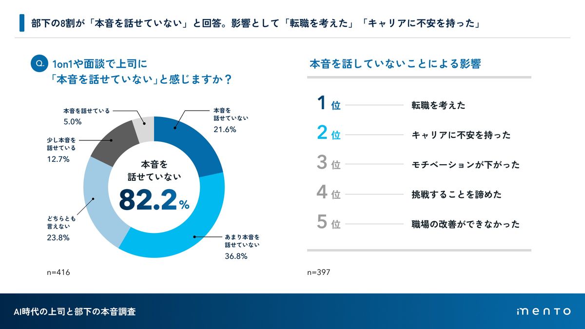 一方、部下に対して1on1や面談で上司に『本音を話せていない』と感じるかと問うたところ、「本音を話せていないと感じる」「あまり本音を話せていないと感じる」を合わせると58.4%の人が本音で話せない傾向にある。本音で話せていないことによる影響としては、「転職を考えた」「キャリアに不安を持った」などが挙げられている。上司と部下はともに「業務の不安や弱音」「仕事やチームへの改善提案」といった内容について本音で話したいと考えており、コミュニケーションの壁が立ちはだかっている状況だ。