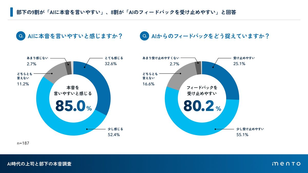では、部下に対してAIだと本音を話やすいかの問いには、「とても感じる」「少し感じる」を合わせて85.0%が話しやすいと回答した。AIからのフィードバックに対しても、「受け止めやすい」「少し受け止めやすい」を合わせて80.2%が受け止めやすいと回答しており、上司と話すよりもコミュニケーションが取りやすいようだ。