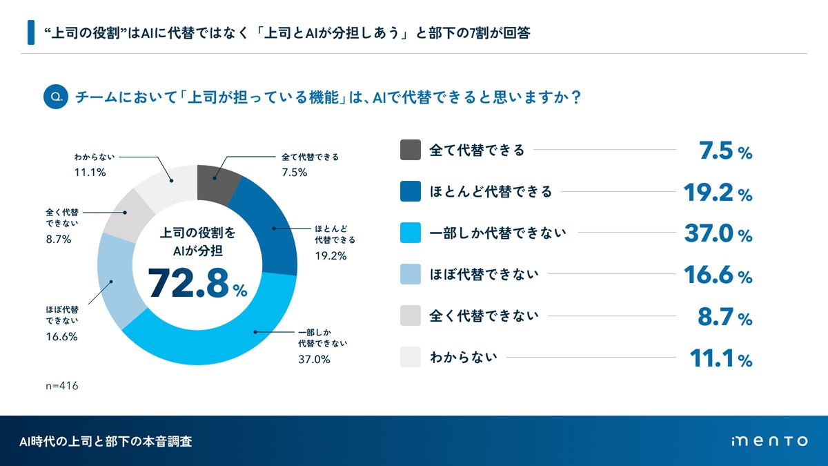 ただ、チームにおいて「上司が担っている機能」はAIで代替できるかという問いに対し、「すべて代替できる」「ほとんど代替できる」を合わせて代替可能と回答したのは26.7%にとどまった。一方、「一部しか代替できない」「ほぼ代替できない」と回答した人は51.6%に上った。全体としては、一部の機能を代替させることは良いという傾向にあるようだ。