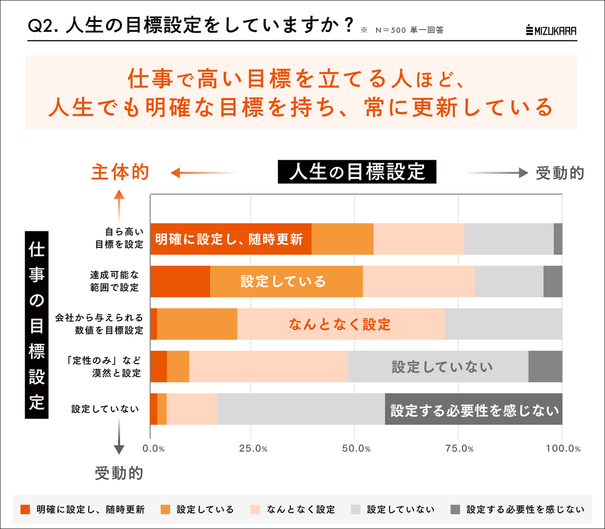 調査で最も興味深いのは、仕事での目標設定の姿勢が私生活の人生設計にまで影響している点だ。仕事で「自ら高い目標を設定」する人は、人生においても「明確に設定し、随時更新」する傾向が顕著に現れている。一方、仕事で目標設定をしない人の大部分が人生でも「設定する必要性を感じない」と答えている。