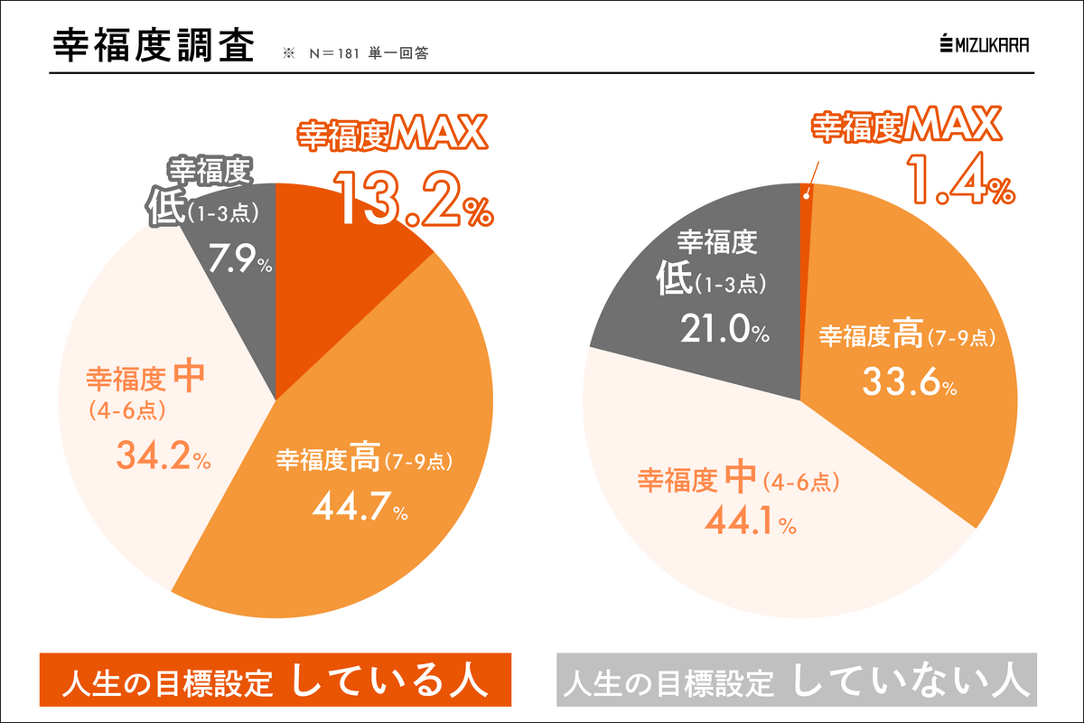 目標設定の有無が働く人の幸福度に影響することが明らかになった。株式会社ミズカラが実施した調査によると、人生の目標設定をしている人としていない人では、幸福度の最高点をつける割合に約10倍の開きが見られることがわかった。