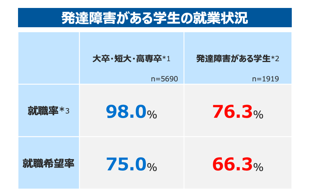 文科省等が2024年に実施した調査では、発達障害のある人の就職率は76.3%と、大卒・短大卒・高専卒の定型発達の人(98%)と比較して、約22ポイントも低い。さらに就職希望率も66.3%と定型発達の人(75%)を約10ポイント下回り、就職活動をする前の段階で就職を諦めてしまっている人の割合が、決して少なくないことが推測される。