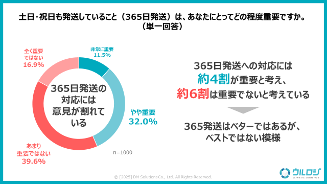 土日祝日の365日発送については、「あまり重要ではない」が39.6%、「全く重要ではない」が16.9%で合計約6割が重要視していない結果となった。週末や祝日を挟むことで配送が遅れることについて、多くの消費者は一定の理解を示している傾向がうかがえる。