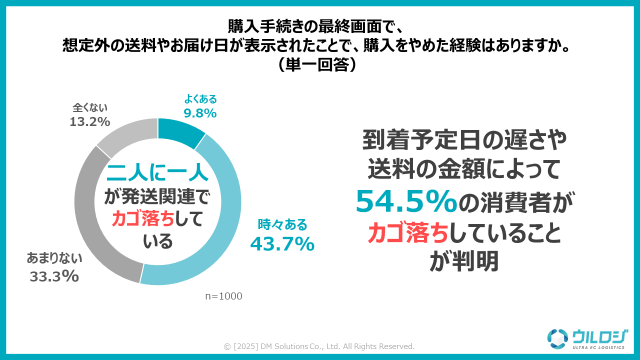 ECサイトでの購入中断、いわゆる「カゴ落ち」についても注目すべき実態が明らかになった。購入手続きの最終画面で想定外の送料や届け日が表示されて購入をやめた経験について、「よくある」が13.2%、「時々ある」が43.7%で、合計54.5%が経験していることがわかった。
