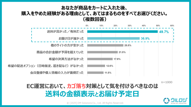 具体的な理由では、「送料が高かった/有料だった」が49.7%で最も多く、「お届け日が遅かった」の36.9%を大きく上回った。多くのユーザーが商品選択段階では表示されていなかった送料が決済画面で初めて加算されたり、想定より配送が大幅に遅れることが判明したりして、購入意欲を失っていることがわかる。