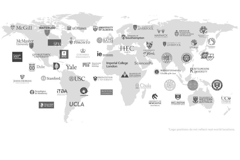 「世界6000以上の大学・教育機関」には、U.S. News & World Report による世界大学ランキング上位100校のうち99校、カナダの研究大学グループ「U15」、イギリスの「ラッセル・グループ」、オーストラリアの「Group of Eight(Go8)」など、各国を代表する一流大学が含まれる。