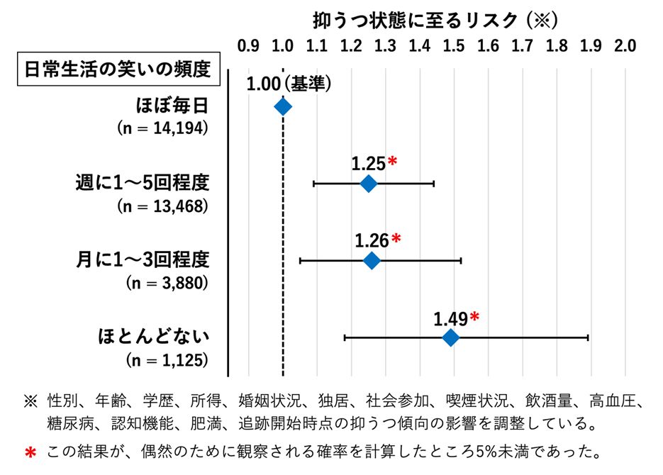 参加者には、声を出して笑う機会が「ほぼ毎日」、「週に1〜5回程度」、「月に1〜3回程度」、「ほとんどない」のいずれかを回答してもらい、抑うつ状態を判断する15項目の質問に答えてもらった。その結果を統計学的な方法で分析したところ、ほとんど笑わない人は、ほぼ毎日笑う人にくらべて抑うつ状態の発生リスクが1.5倍も高いことがわかった。さらに、笑いの頻度が低いほど、発生リスクが高まる傾向も確認された。「笑わないから抑うつ状態に至る」ことが実証されたことになる。