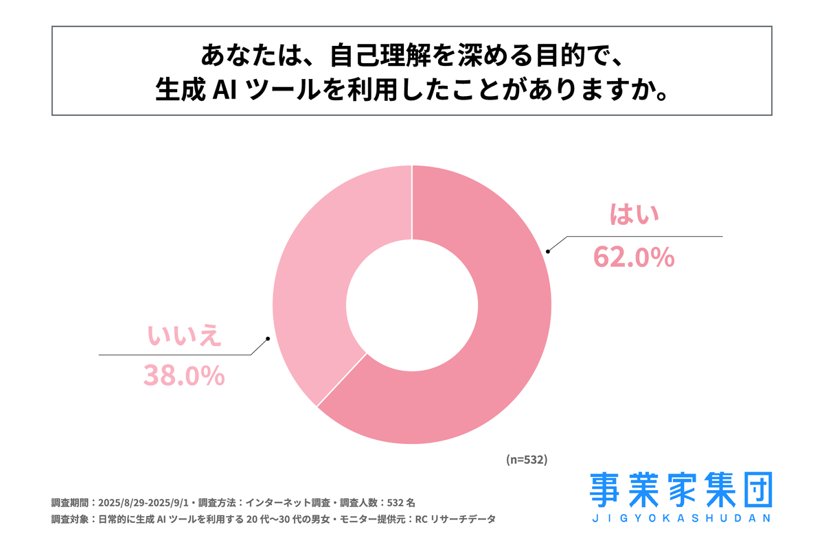 調査によると、日常的に生成AIツールを利用する20代〜30代の62.0%が、自己理解を深める目的でAIを利用した経験があると回答した。