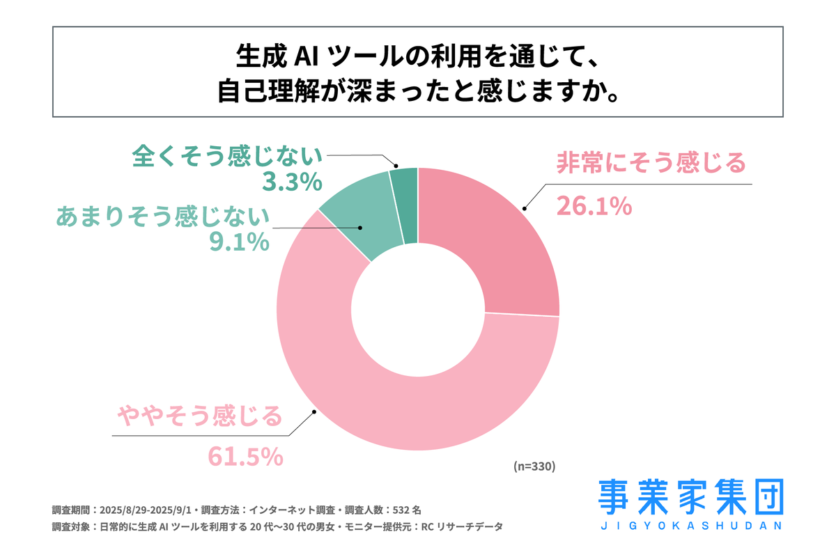 注目すべきは、自己理解目的で利用した330名のうち87.6%がAIを通じて「自己理解が深まった」と実感している点だ。「非常にそう感じる」が26.1%、「ややそう感じる」が61.5%で、大多数が何らかの効果を得ていることがわかる。