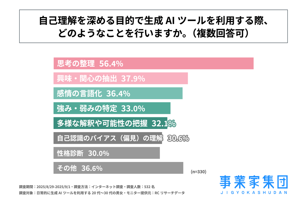 具体的な利用内容では「思考の整理」が56.4%で最多となり、「興味・関心の抽出」(37.9%)、「感情の言語化」(36.4%)、「弱み・強みの特定」(33.0%)が続いた。