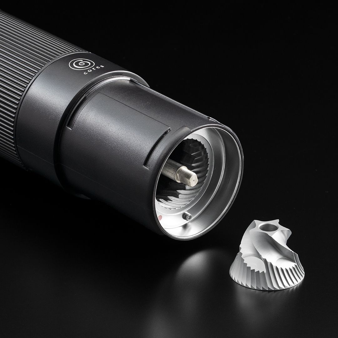 刃の形状は、粒度が均一かつ粒子形状がドリップに最適な粉に仕上がるコーン(コニカル)式を採用している。フレンチプレス向きの粗挽きからエスプレッソに最適な極細挽きまで、幅広い挽き目調整が可能。コンパクトな本体ながら、一度に25g(2〜3人分)を挽くことができるのも嬉しいところだ。