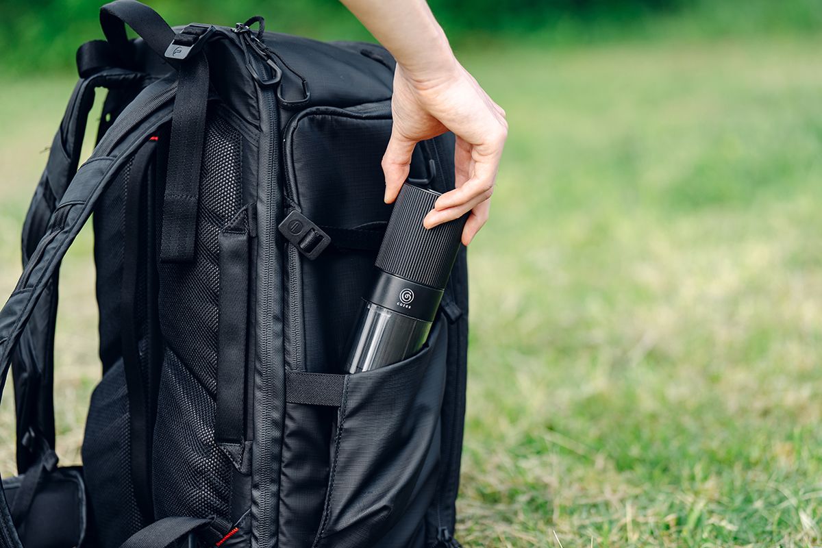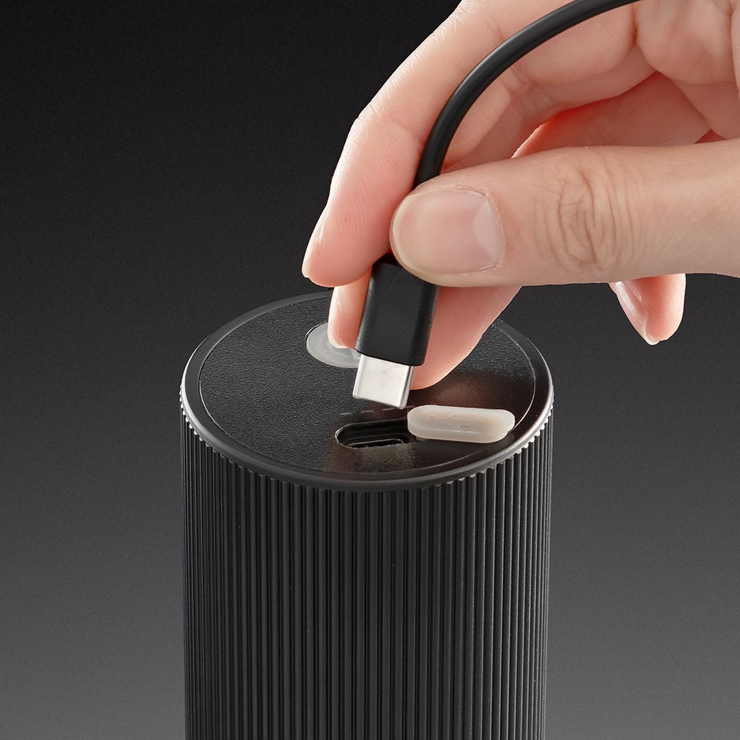 重量約420gと軽量でバッテリーを内蔵しているため、アウトドアやオフィスなど好きな場所で使えるのも特長。フル充電状態で約20〜30回は使用できて、充電が切れてしまってもモバイルバッテリーから再充電が可能だ。