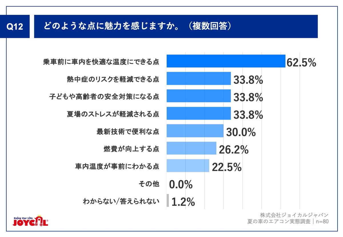 最近の車には、乗車前にスマートフォンのアプリから遠隔操作でエアコンを始動できる機能が搭載されている。調査では7割以上が「知らなかった/詳しくは知らない」と回答した一方で、約8割が「関心あり」と答えた。