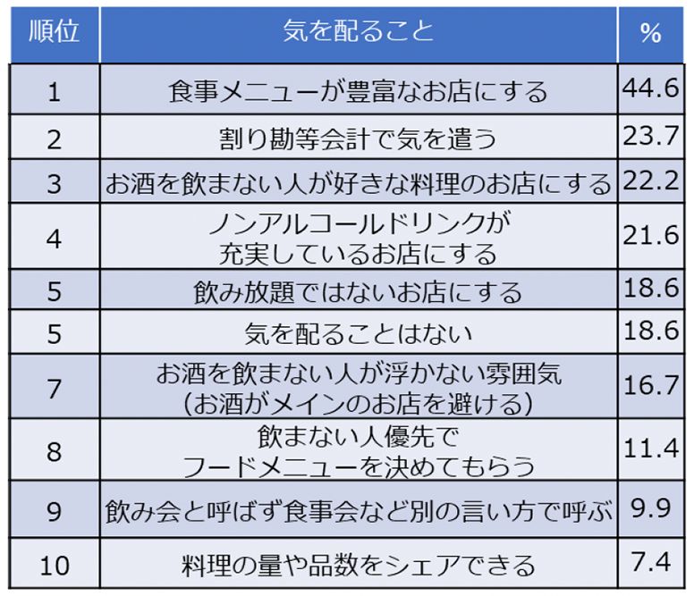 お酒を飲まない人を含むグループで食事に行くとき、何に気を配るかを尋ねると、もっとも多かったのが「食事メニューが豊富なお店にする」だった。お酒を飲まない人が好きな料理の店にする、ノンアルコールドリンクが充実している店にする、お酒がメインの店は避ける、飲まない人優先でフードメニューを決めてもらうなど、飲む人が飲まない人も楽しめるよう気を配っています。2位に入ったのは「割り勘などの会計で気を遣う」でした。