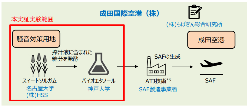 実証実験では、炎龍の栽培をスイートソルガムの栽培実績のある農業法人HSSが担当。バイオエタノールの製造には神戸大学大学院工学研究科が開発した技術を使用する。また将来的に、SAFの製造は、触媒を使ってアルコールから厳格な規格のジェット燃料を抽出するATJ技術を持つ地元の業者に依頼し、これら一連の事業の千葉県内での拡大可能性などを、ちばぎん総合研究所が調査検討することになっている。