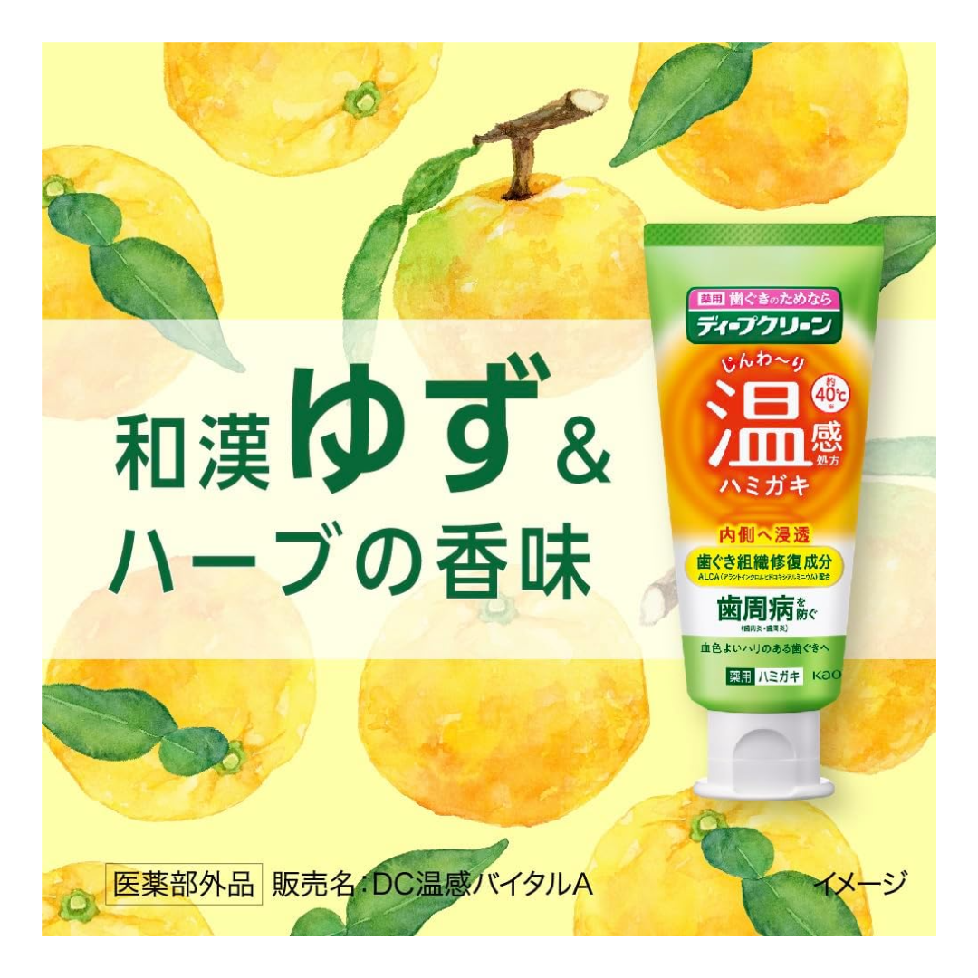 また、口臭や歯肉炎を防ぐ殺菌成分CPC、歯質を強化し虫歯を防ぐ高濃度フッ素(1450ppm)なども配合。和漢ゆず&ハーブの香味も心地よい。