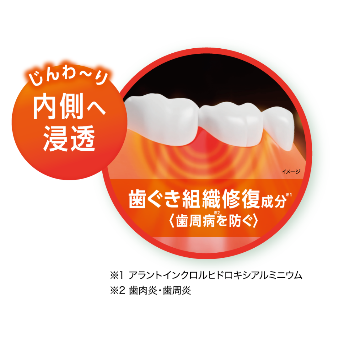配合された歯ぐき組織修復成分ALCAは、磨いているうちに歯ぐきの奥までめぐって内側まで浸透。歯周病(歯肉炎・歯周炎)を予防して、血色の良いハリのある歯ぐきへと導いてくれる。