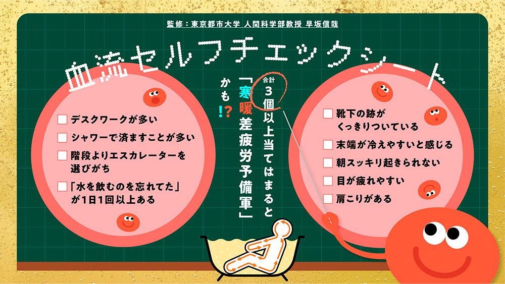 まだ寒暖差疲労を感じていないという人も、これから冬にかけて不調が出てくる恐れは十分にある。そこで、早坂教授は寒暖差疲労予備軍を判定する「血流セルフチェックシート」を考案した。左の項目は生活習慣、右の項目は現在感じている不調だ。全体で3個以上の項目に当てはまると寒暖差疲労予備軍と判定され、十分な注意が必要になる。