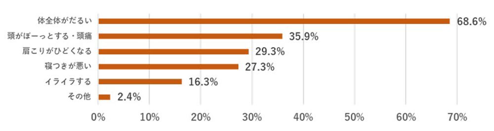 花王は、20〜60代の男女1000人を対象に「寒暖差と入浴に関する調査」を実施した。秋から冬にかけて気温が急激に変化することで体に疲労を感じる人は約8割。体がだるい、頭がぼーっとする、頭痛、肩こり、寝つきが悪いといった症状が多く見られる。そのほか、鼻づまりや咳、鼻水、くしゃみなどを訴える人もいる。