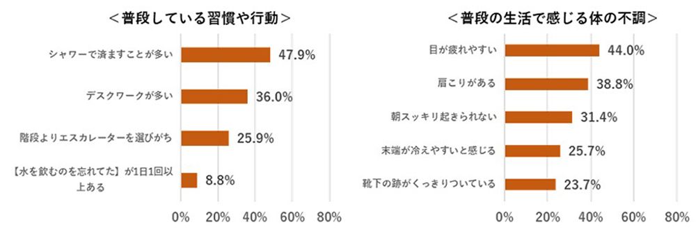 簡単で有効な対策は入浴、とくに血管を広げる効果のある「炭酸浴」で血行促進を促すことだと早坂教授は指摘する。調査では、入浴頻度が低い人(週に1〜2日またはまったく入らない)は、頻度が高い人(毎日または週に3〜6日)にくらべて約1.2倍のだるさを感じていた。