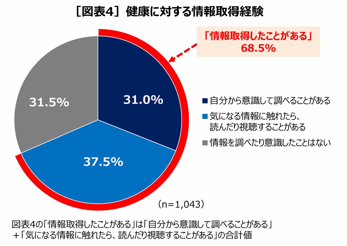 健康に対する情報収集について、「自分から意識して調べることがある」「気になる情報に触れたら、読んだり視聴することがある」を合わせて68.5%の人が情報を取得したことがあると回答。