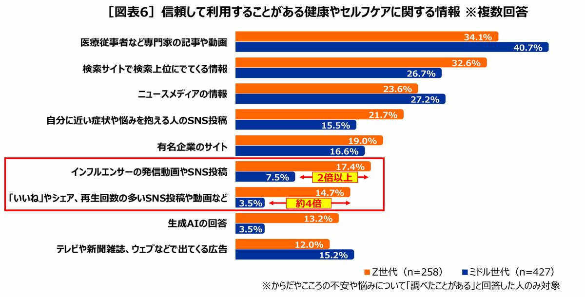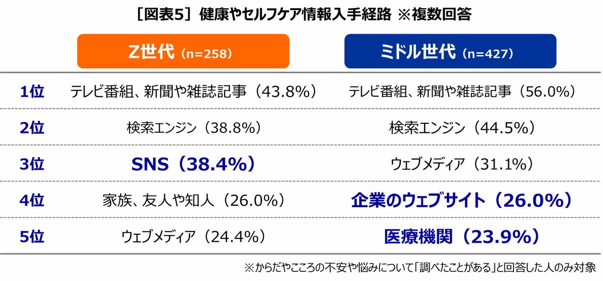 ただ、その情報源については、Z世代、ミドル世代ともに「テレビ・新聞・雑誌などのメディア」がトップで2位に「検索エンジン」となっているが、Z世代は3位にSNSがランクイン。ミドル世代は4位に企業のウェブサイト、5位に医療機関がランクインしており、世代ごとに情報源の違いが明らかになっている。