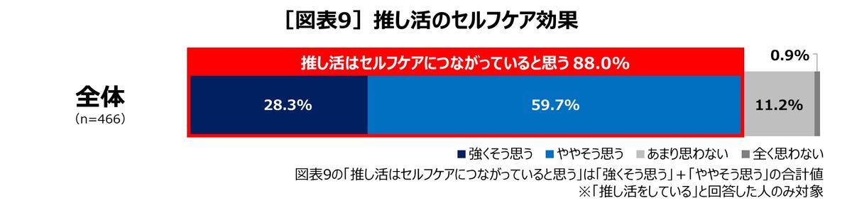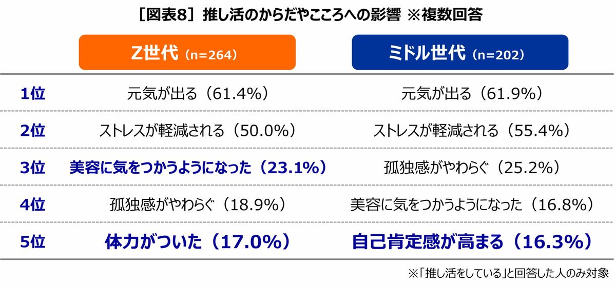また、最近注目されている「推し活」について、Z世代の63.8%、ミドル世代でも32.1%の人が行っていると回答。「元気が出る」「ストレスが軽減される」のほか「美容に気をつかうようになった」「体力がついた」などの回答があり、推し活がセルフケアにつながっていると考えている人も88%いた。