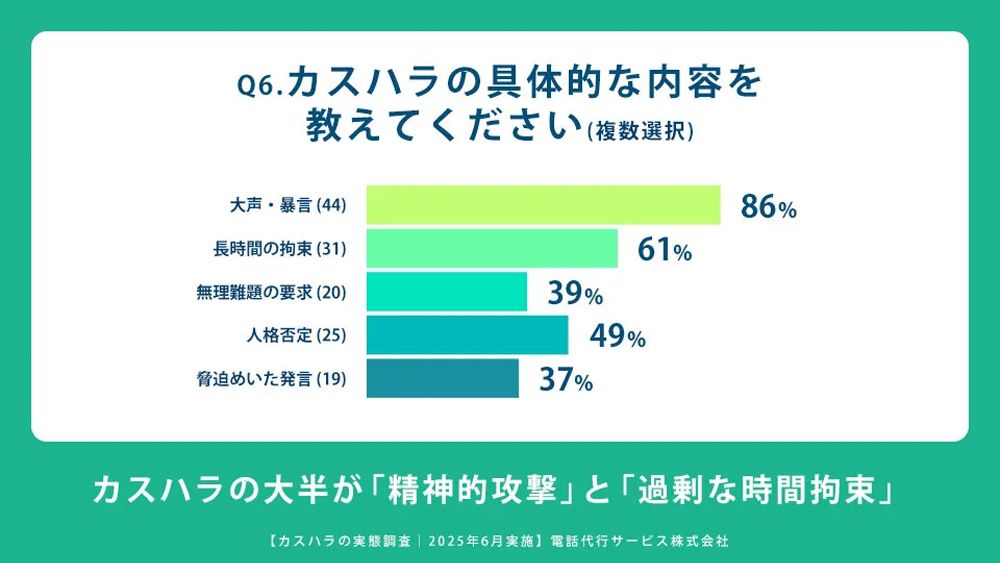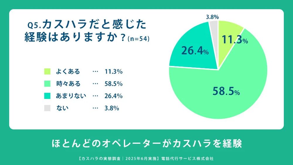 電話代行やコールセンター代行などのサービスを提供する電話代行サービス社(以下、同社)は、社内のオペレーター54人を対象にクレームやカスハラ対応に関する意識調査を行った。それによると、カスハラを受けたと感じた経験を持つ人が「よくある」と「ときどきある」をあわせて約7割にのぼる。「あまりない」を加えると、ほぼ全員が1度は経験していることになる。