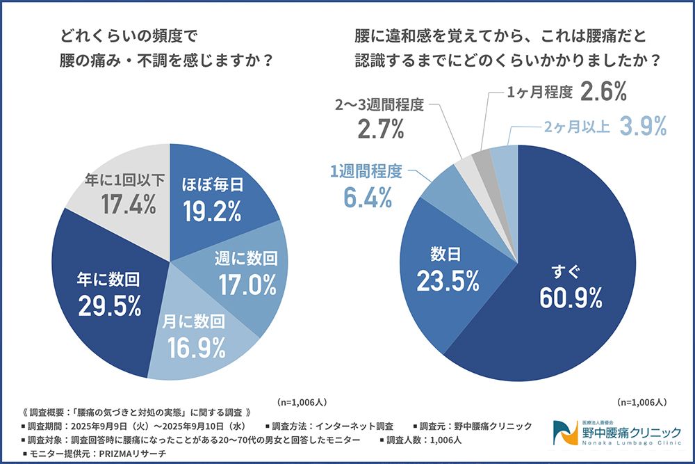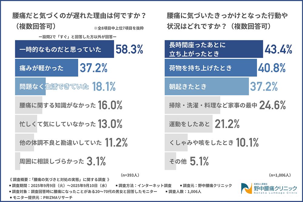 野中腰痛クリニックは、20〜70代の腰痛経験者1006人を対象に「腰痛の気づきと対処の実態」に関する調査を実施した。それによると、腰に違和感を覚えてから腰痛だと認識するまでに数日以上の時間を要した人が約4割。理由として、一時的なものだと思った、痛みが軽かったなどがあげられ、腰痛を軽く見ていたことがわかる。
