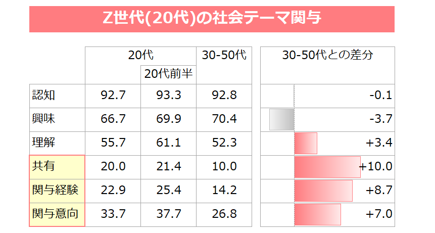 調査では全23種の社会問題について「認知」「興味」「理解」「共有(SNS等での投稿・発信)」「関与経験」「今後の関与意向」のいずれかに該当する割合を世代別に集計した。その結果、Z世代(20代)は「共有」が20.0%で30~50代より10.0ポイント高く、「関与経験」は22.9%(+8.7ポイント)、「関与意向」は33.7%(+6.9ポイント)と、社会問題に対する当事者意識が際立って高いことが判明した。