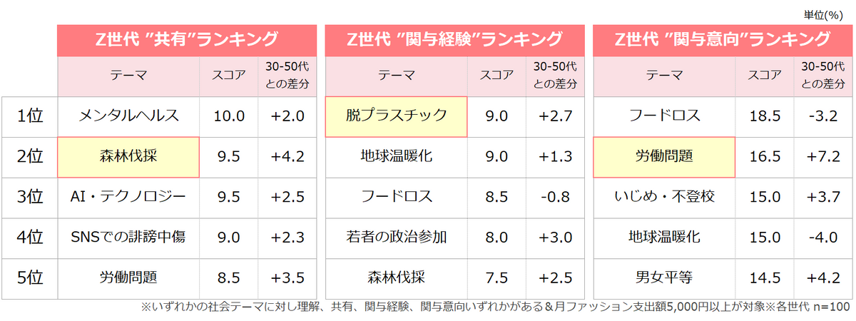 特に20代前半に限ると関与意向は37.7%にまで達し、単なる関心にとどまらず、実際に行動を起こす姿勢が鮮明だ。関与している社会問題の内訳では、森林伐採、脱プラスチック、労働問題などで上の世代との差が大きく、環境問題と労働環境への意識の高さが目立つ。
