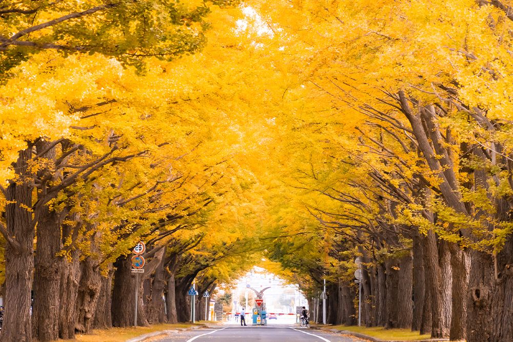 黄金色のカラマツが約9キロメートル続く日本一長い防風林「10線防風林」が魅力。例年の見ごろは9月下旬から10月上旬。