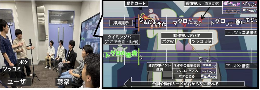 名古屋大学大学院工学研究科博士前期課程学生の小松駿太氏らによる研究グループ(佐藤・小川研究室)は、漫才実演支援システム「漫才カラオケ」を開発した。ネタの台詞やタイミングが、音ゲーの楽譜のように画面を流れる。そのとおりに演じれば漫才になるというものだ。